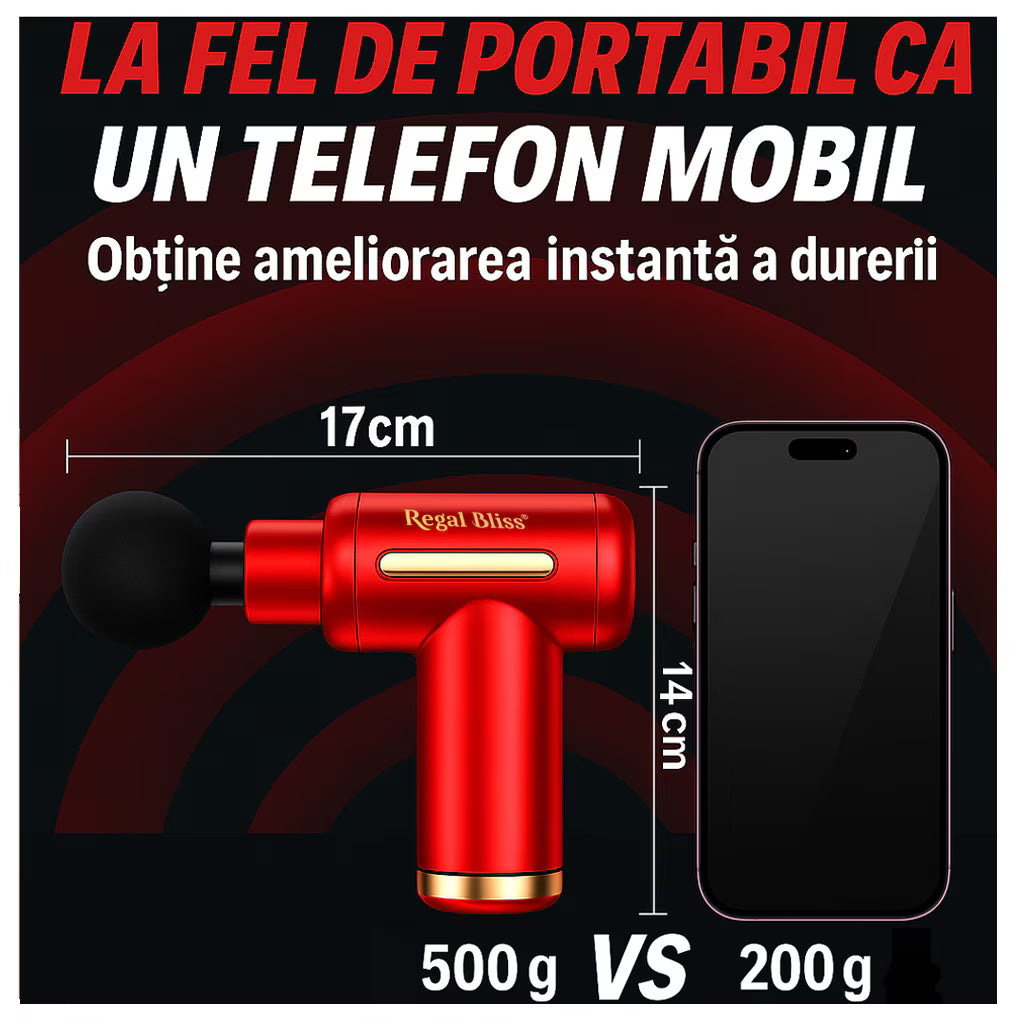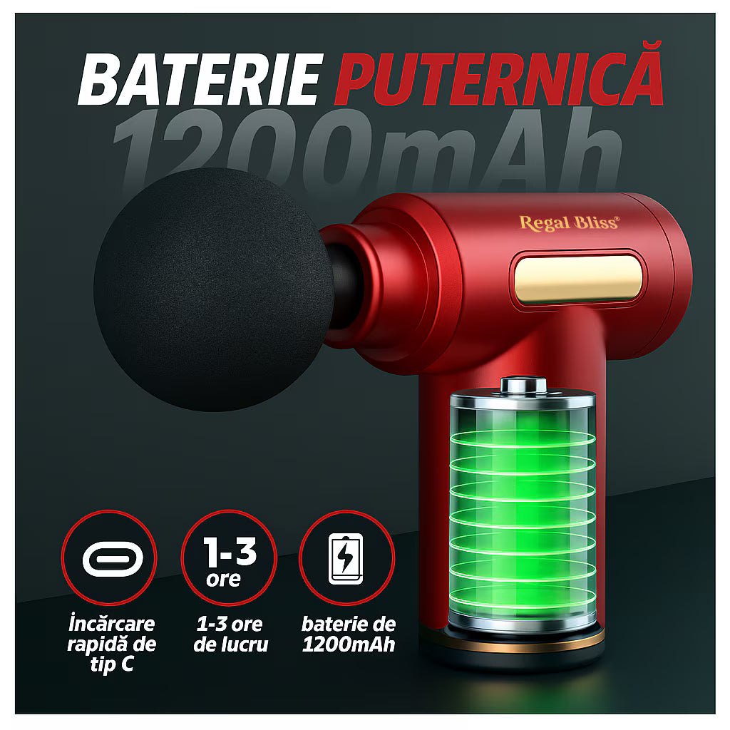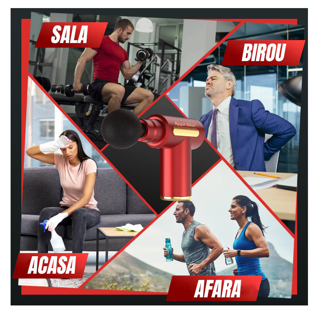 Aparatul de masaj profesional Regal Bliss® (tip pistol) îți oferă masaj profund pentru spate, umeri, picioare și brațe. Cu 6 trepte, 4 capete, motor ultra-silențios (~45 dB) și ecran LCD, te ajută să reduci tensiunea și oboseala musculară direct acasă.