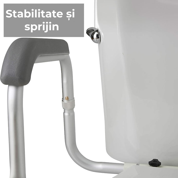 Structură din aluminiu rezistent si mânere căptușite pentru confort. Picioarele cu protecție antiderapantă ajută la stabilitate chiar și pe gresie umedă. Cadrul se montează ușor direct pe vasul de toaletă.