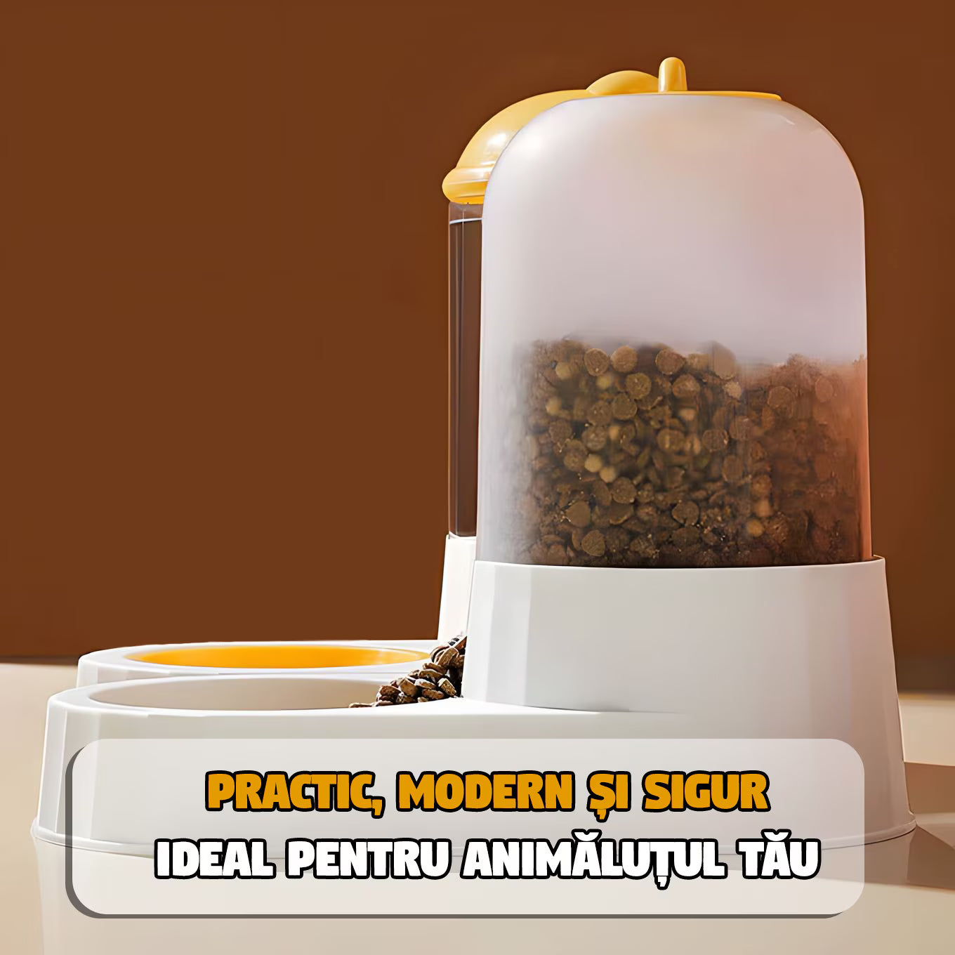 Dispenserul 2-în-1 apă + hrană este conceput pentru câini și pisici, oferind acces constant la