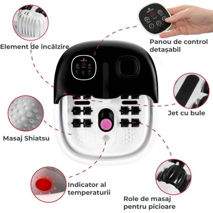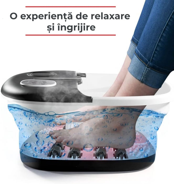 Aparatul de hidromasaj pliabil pentru picioare combină căldura apei, vibrațiile, rolele și bulele pentru a reduce tensiunea, a susține circulația periferică și a alunga senzația de picioare grele – direct la tine acasă.
