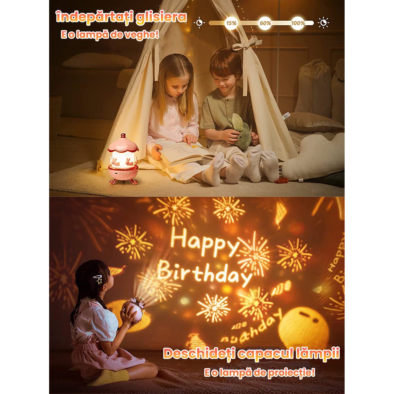 proiecții 360° și lumini ajustabile, perfecte pentru rutina de seară.