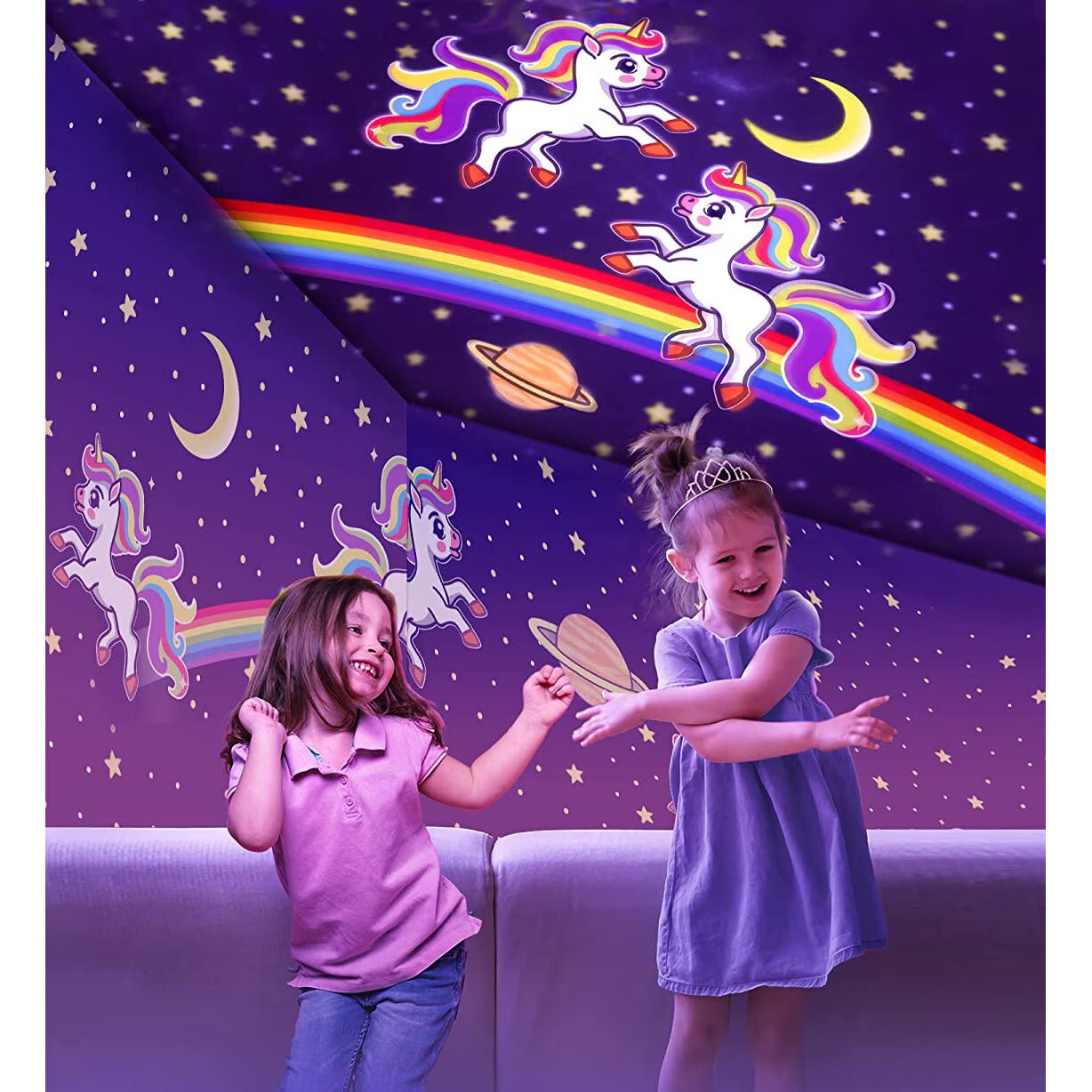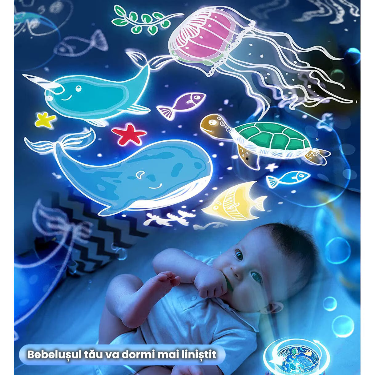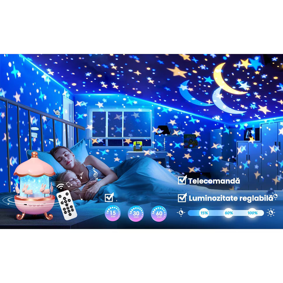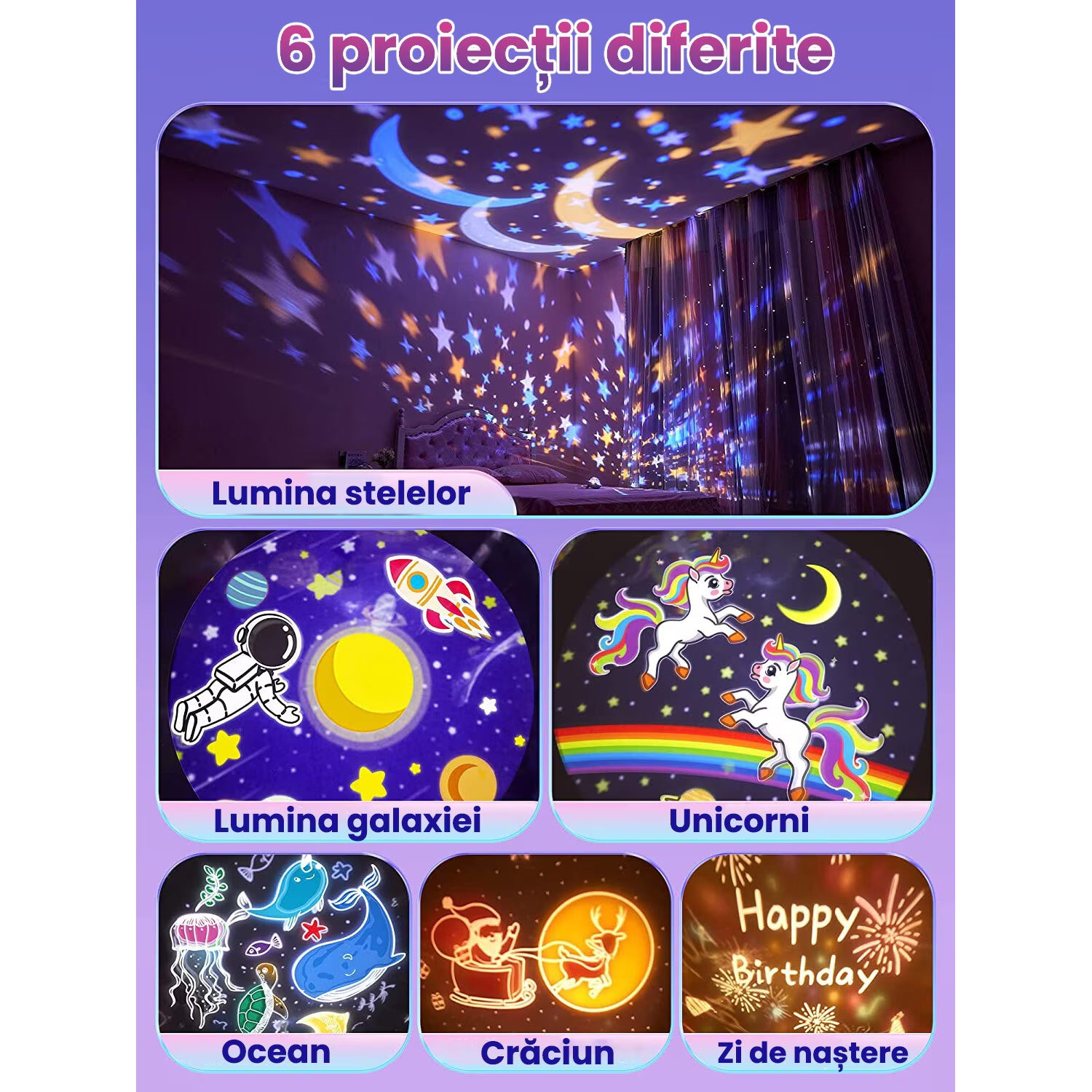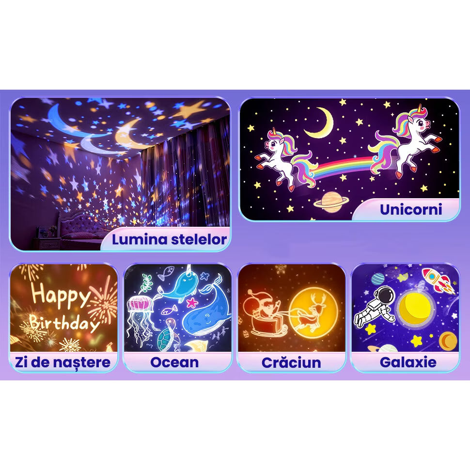 Include 6 filme de proiecție (galaxie, cer înstelat, mare etc.) și 12 modele de culori pentru pereți/tavan, cu efect vizual wow, fără lumină agresivă.