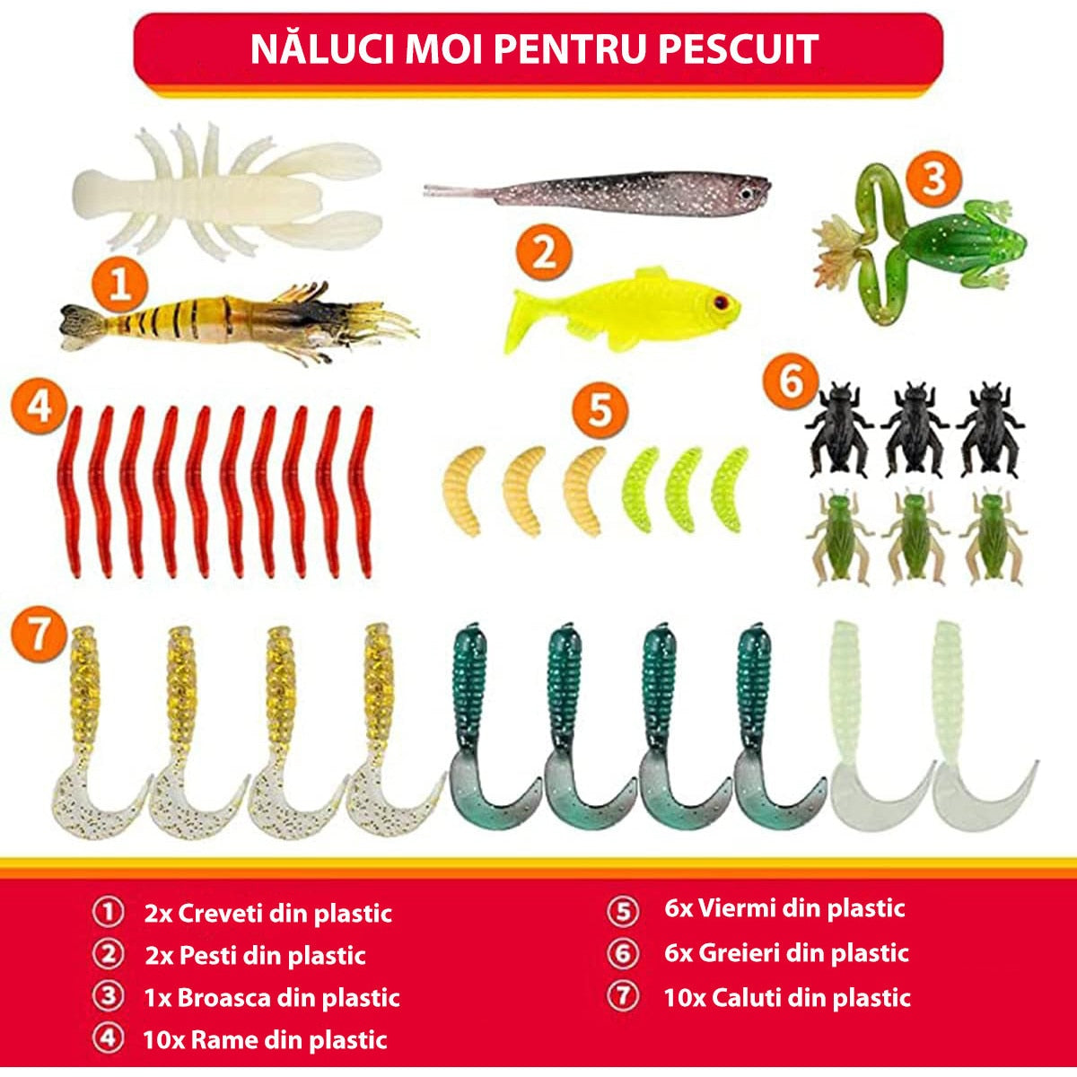 Setul Fish & Paws® conține 78 de piese (momeli artificiale + accesorii),
