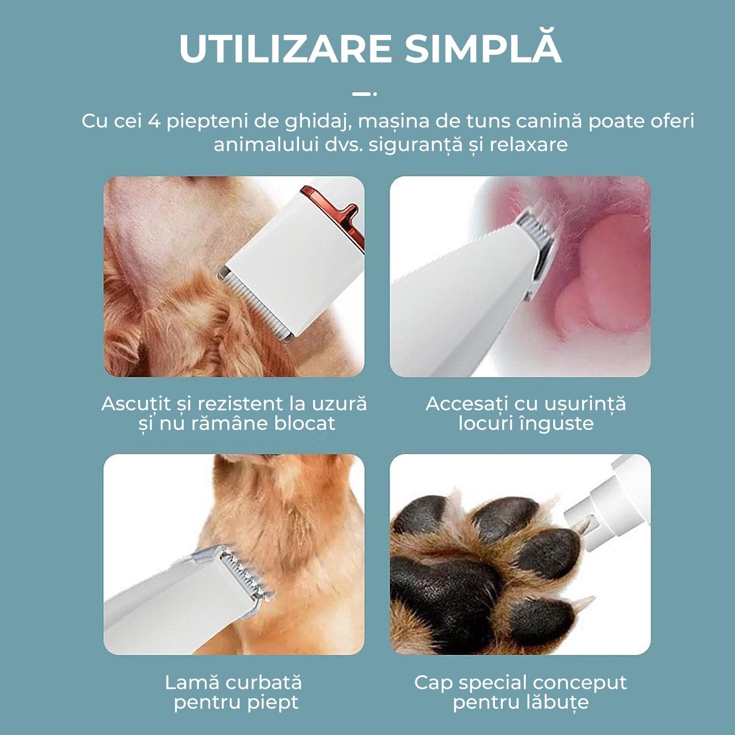 Ajunge ușor în zone înguste: urechi, lăbuțe, bot și contur.